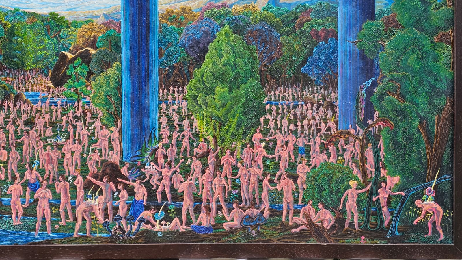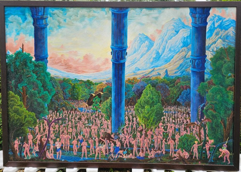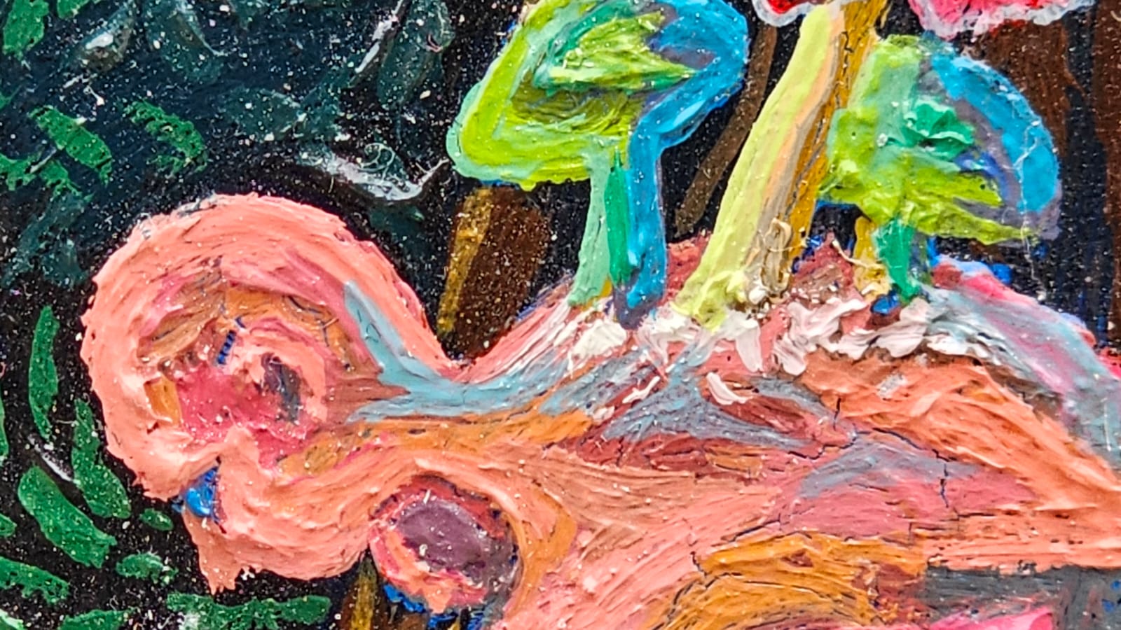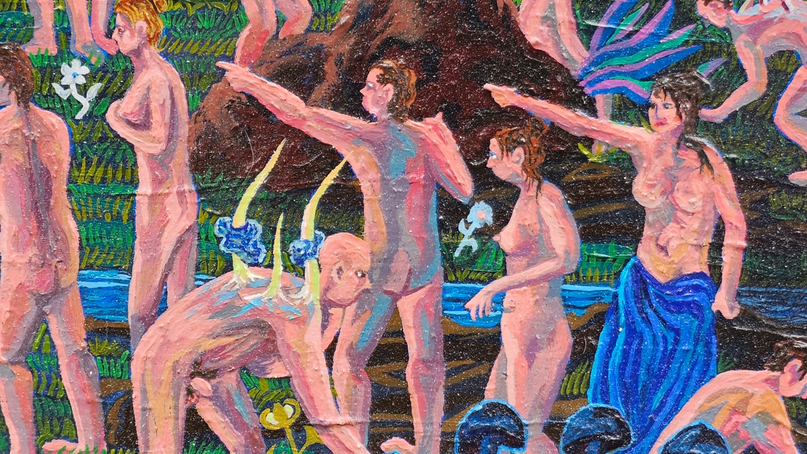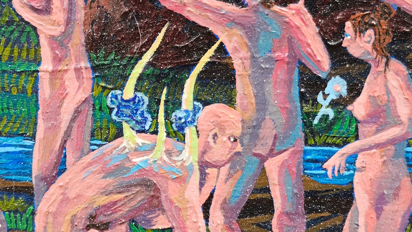 Around the time I bought the painting from Andrew, he described the curious features appearing to grow out of the bodies of some of the figures in the foreground. Fascinatingly he called them ‘viruses’. This to my mind was so significant, as it was just before COVID times .. a virus of an altogether different sort, but uncannily prescient of the times to come and how it changed the world.