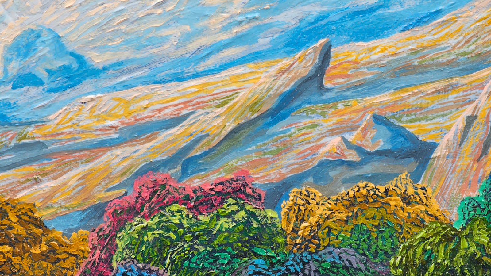 “Andrew works with metaphor, symbolism and allegory. He draws a lot of his concepts from historical painting combined with his own experiences, as he adds invented myths and narratives to his images. Each painting is individualistic and seeks to communicate a message about its subject to the viewer. His practice plays with the traditional norms of landscape and figurative painting and uses it as a vessel to convey ideas and thoughts, both from direct observation and his own interpretation. Andrew wants to use his paintings in a conceptually abstract and philosophical way, to communicate different ideas through experimentation with composition and the subversion of expectations.”